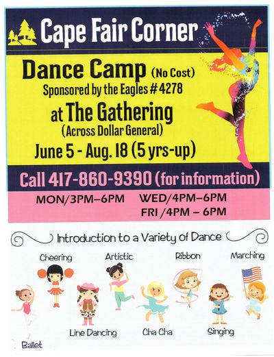 We will be holding a FREE dance camp for children ages 5 and above. This will be held at The Gathering just across the street from Dollar General in Cape Fair. It will include an introduction to a variety of dances.